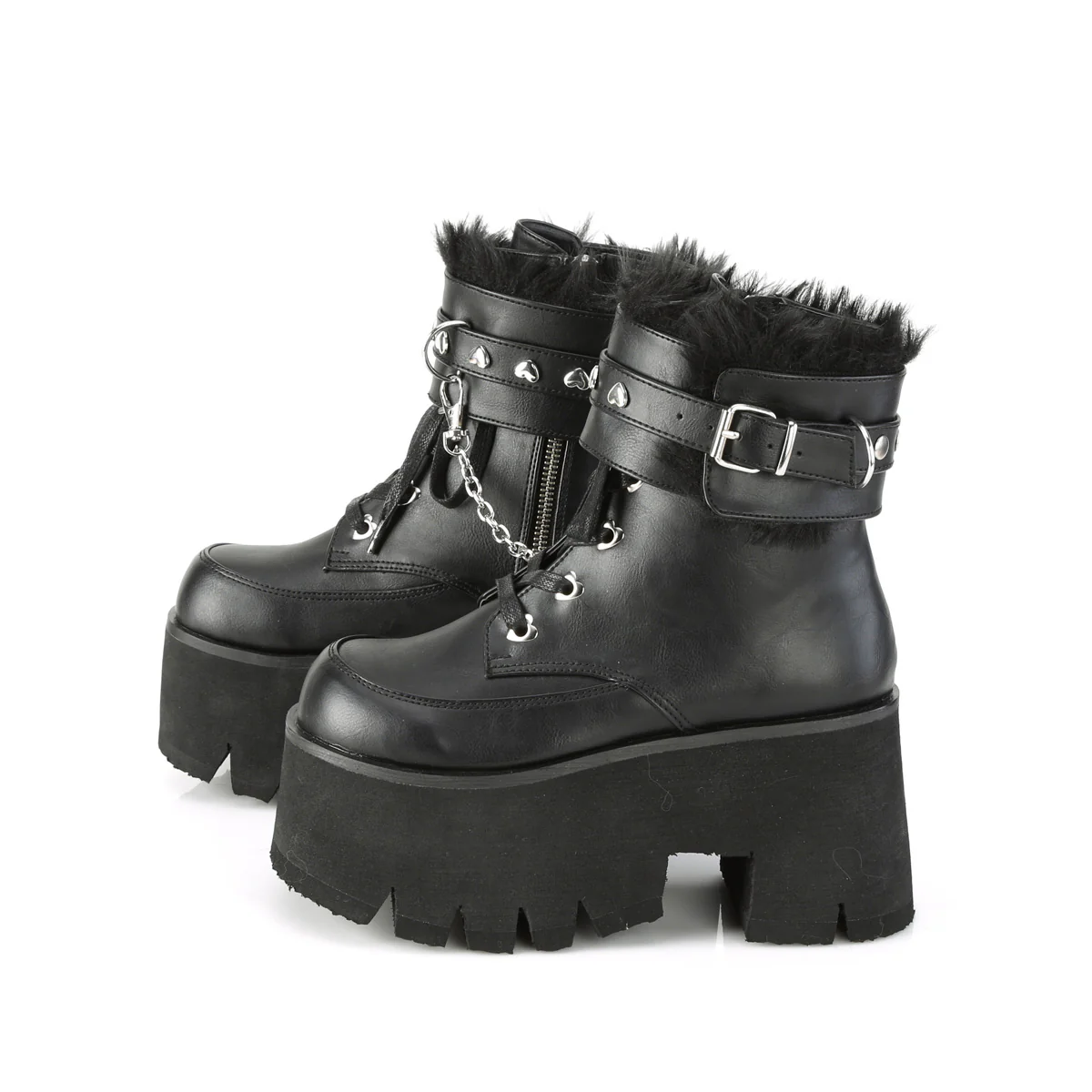 Unleash your inner rebel with Ashes-57 ankle boots. Crafted with attention to detail, these boots feature a 3.5" chunky heel and a 2.25" cut-out platform to give you a commanding presence. The heart eyelet lace-up design adds a playful touch, while the fur-lined adjustable removable ankle cuffs with heart studs bring a daring edge. Complete with D-ring and chain with swivel snap hooks, these boots demand attention with every step. Made from black vegan leather, they not only look great but also align with your compassionate values.