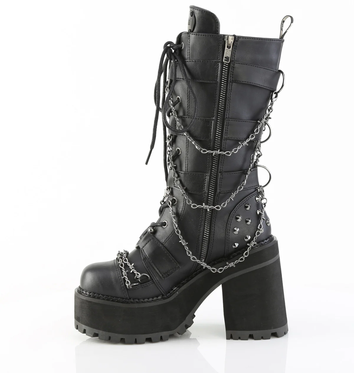 Meet the Assault-117—a boot built for those who like their style with a little extra bite. The 4 3/4" block heel and 2 1/4" cleated platform give serious lift, while the lace-up front keeps things snug. Metal cone studs line the hook-and-loop straps, each centered with a bull ring for extra attitude. And if that wasn’t enough, the clip-on barbed wire chain and D-ring details take it up another notch. Made in black vegan leather, these mid-calf boots are ready to stomp straight into your rotation.