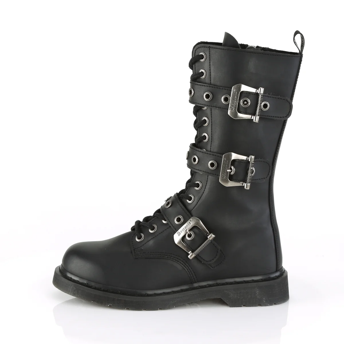 Embrace the fusion of punk and modern fashion with the Bolt-330 mid-calf combat boots. These boots boast a sturdy 1 1/4" heel and are constructed from high-quality black vegan leather, showcasing a commitment to ethical fashion. Designed with a 14 eyelet lace-up system and enhanced by triple buckle straps, they offer an audacious look that complements any outfit. The addition of an inside zip closure adds a touch of practicality to its rugged charm, making them an ideal choice for adventurers of style.
