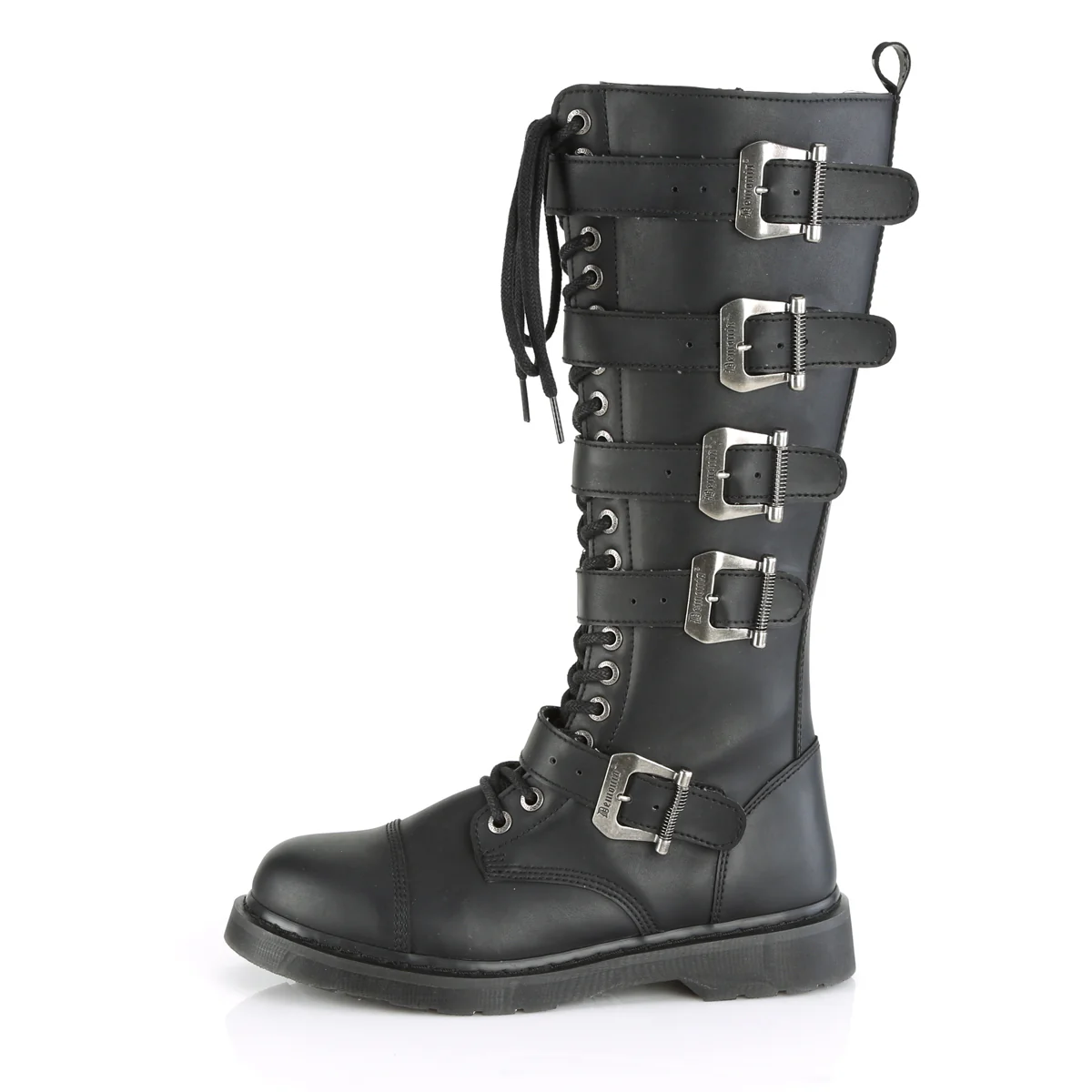 Step into the battlefield of style with the Bolt-425, the ultimate unisex knee-high combat boot. Featuring a modest 1 1/4" heel, these knee-high stalwarts are fortified with 20 eyelets and fastened by five adjustable buckle straps, exuding a punk flair that's both timeless and modern. The convenient inside zip closure ensures these boots aren't just about fierce looks—they're practical too.Â