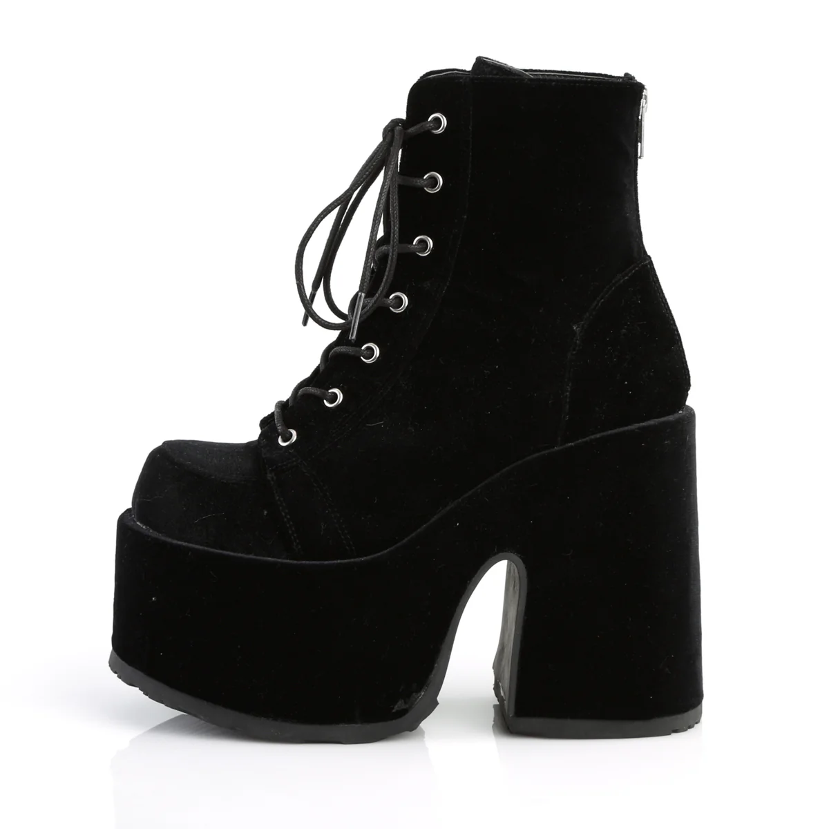 Looking for the perfect blend of style and comfort? Look no further than the stunning Camel-203 ankle boots. Made from black velvet, these sleek boots feature a chunky 5" heel and 3" platform that offer support without sacrificing style. The lace-up front provides a secure and adjustable fit, while the metal back zip closure allows for easy on and off. Style them with your favorite alt outfit for a head-turning look that's sure to make a statement. Shop the Camel-203 ankle boots today and take your wardrobe to the next level.