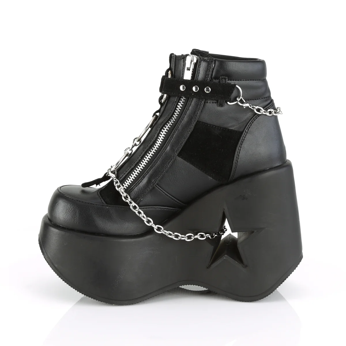 Step into the spotlight with the Dynamite-101 Ankle Boot, where fashion meets a cosmic twist. Its 5" star cutout platform wedge and center O-ring, embellished with bold stud details, make a galactic statement. Black vegan leather and vegan suede mingle to create a look that's out of this world. Secure top hook n' loop straps accented with chain ornamentation not only catch the eye but add a hint of rock-and-roll flair to every step you take. Complete with a convenient side zip, embrace the universe under your feet with these celestial stunners.