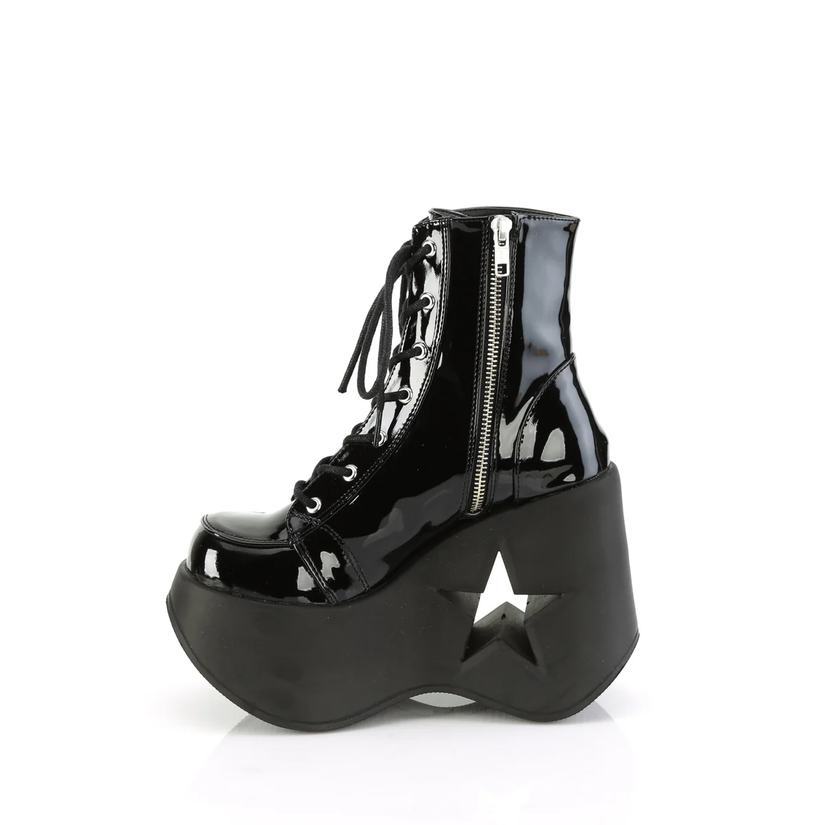 Step into a world where fashion meets fantasy with the Dynamite-106 ankle boot. The 5" star cutout platform wedge is not just a shoe, but a statement of unrivaled style and boldness. Its black patent finish gleams under any light, captivating the gaze of onlookers. Featuring a lace-up front and an inner side metal zip closure for ease of use, this boot is the perfect blend of edgy design and practicality. Wear the Dynamite-106 and become the star of your own show.
