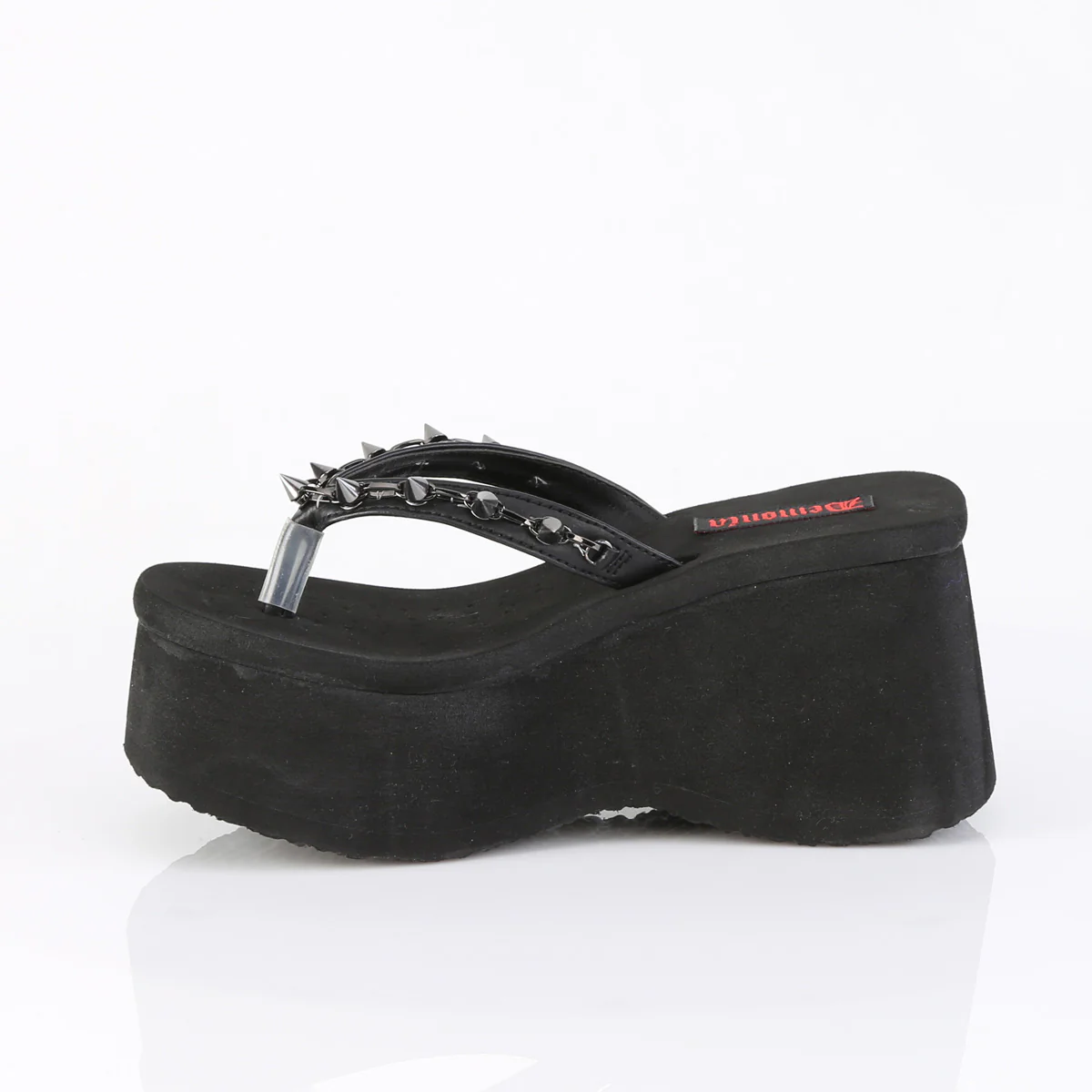 Meet Funn-35âyour new favorite platform sandal. The 3.5" lift gives you just the right boost, and the black vegan leather keeps things sleek and versatile. But the real stars? The metal chains and cone spikes on the straps, adding just the right amount of edge. These sandals are perfect for festivals, nights out, or just making your everyday look a little more exciting. Walk tall, walk boldâFunn-35 has your back (and your feet).