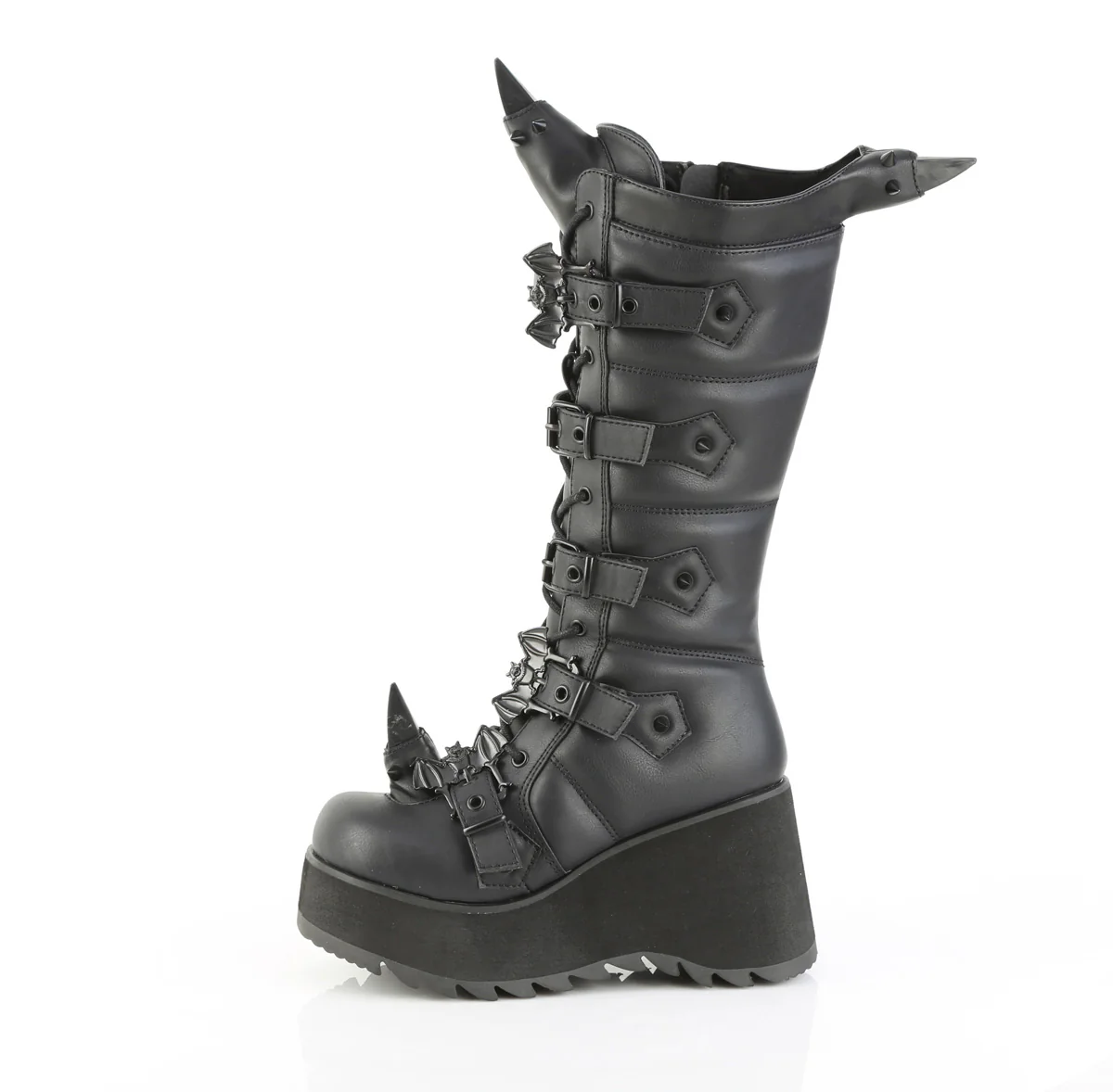 3 1/2" (89mm) Platform Lace-Up Knee High Boot Featuring Eyeleted Centered Bat Buckle Straps & Rubber Spiked Rhino Horn Detail on the Toe, Upper Back & Tongue, Full Length Inner Side Metal Zip Closure