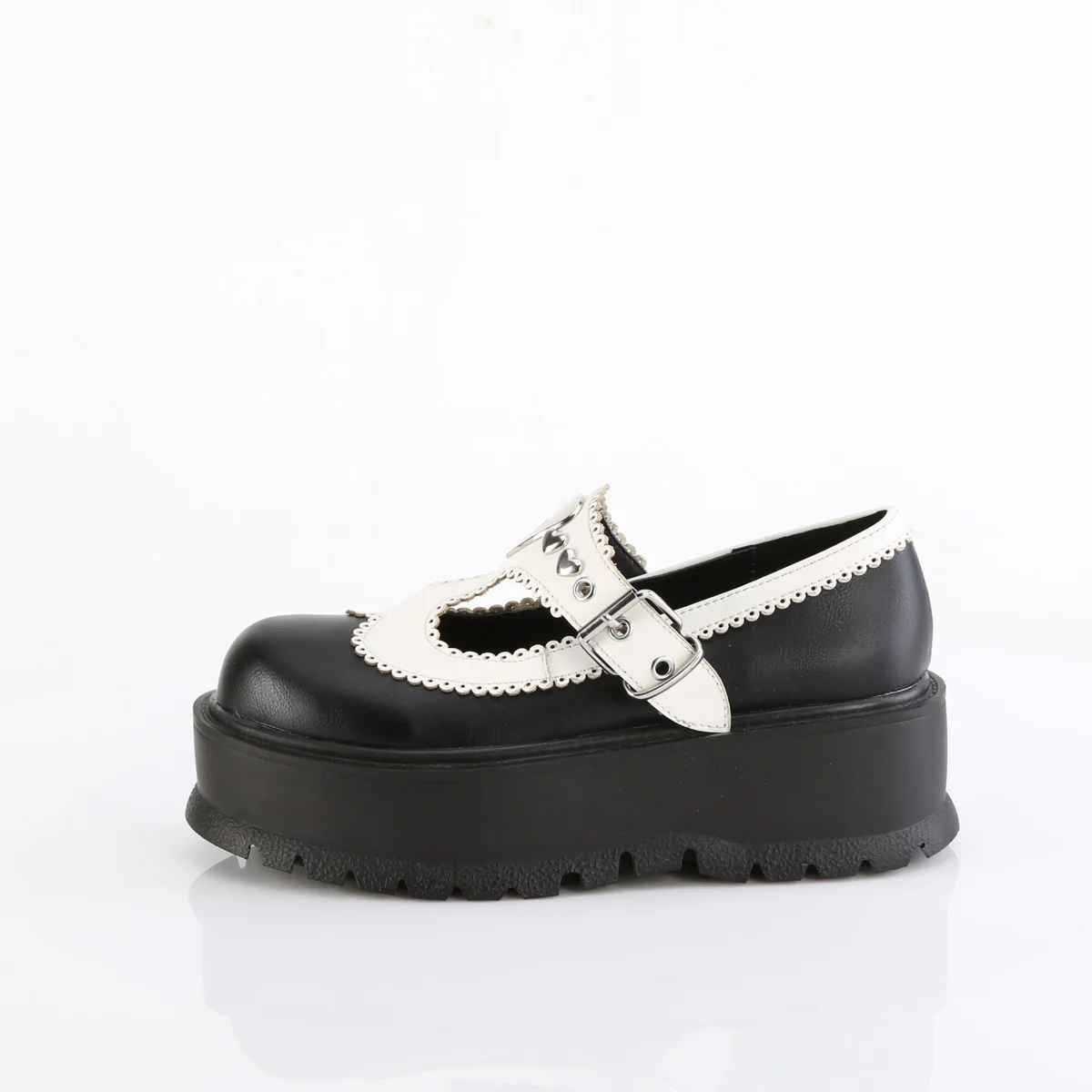Make a statement with the Slacker-23 Maryjane shoes. These shoes feature a 2" platform and a T-strap design adorned with heart studs. The oversized center heart eyelet and scallop edge details bring a touch of feminine charm to the punk-inspired style. Crafted from black and white vegan leather, these shoes are perfect for those who want to make a bold statement while staying ethically conscious. Step into these shoes and add a unique edge to your alternative fashion.