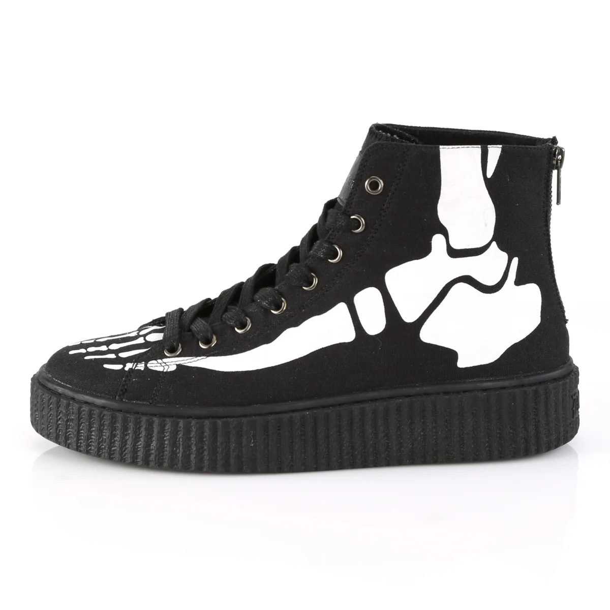 Step into the Sneeker-252, where street style meets a touch of the unexpected. The chunky rubber sole and lace-up front keep things classic, while the full back zipper provides practicality. The black canvas is printed with an X-ray bone design—subtle but striking. High-top, platform, and just a little rebellious, these sneakers are built for those who like their kicks with a twist.