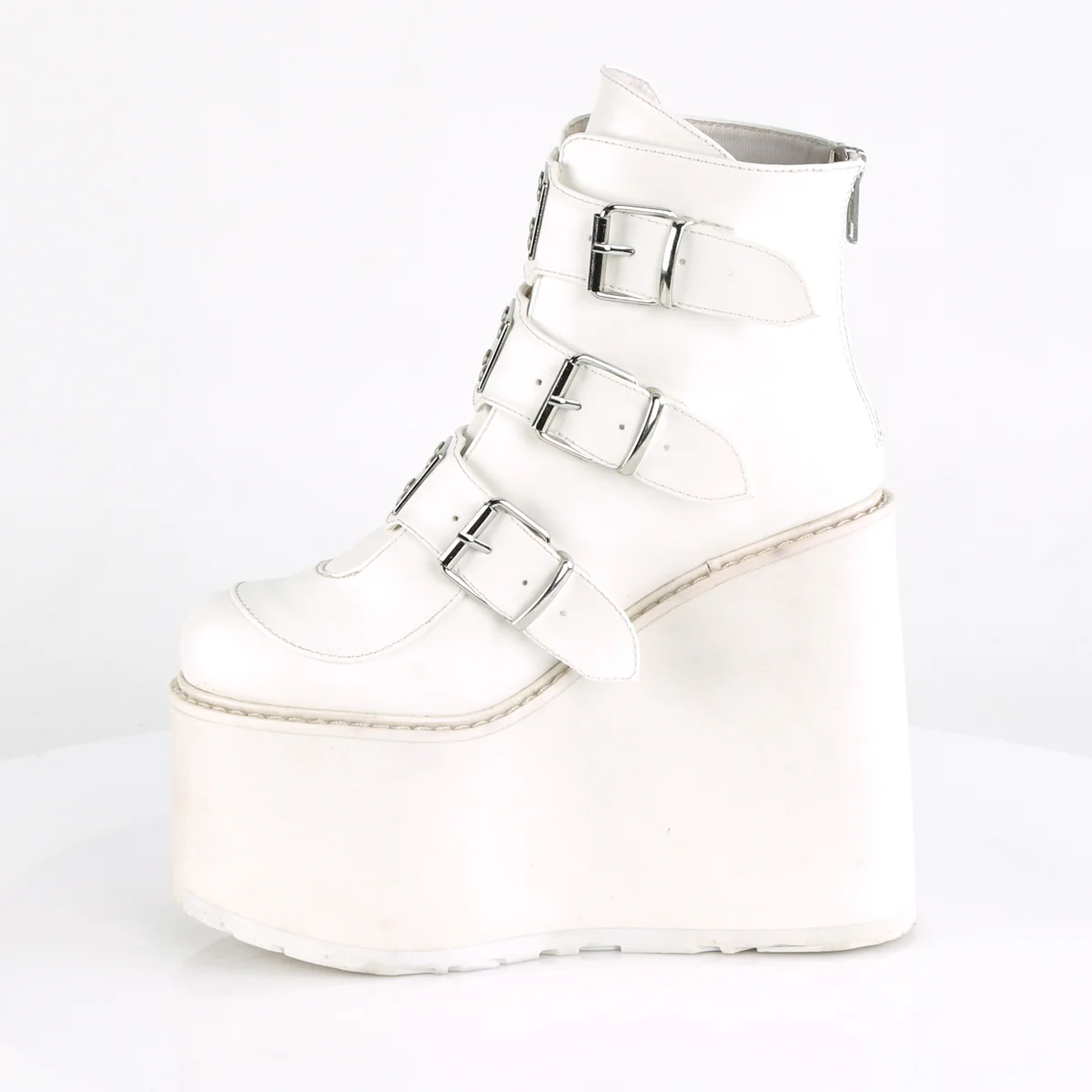 Step into the spotlight with the Swing-105, a boot that combines cutting-edge style with comfort. This ankle boot's 5 1/2" wedge platform, wrapped in premium white vegan leather, offers height without sacrificing wearability. The centerpiece, three buckle straps featuring silver chrome-plated metal plates, creates a visual intrigue that complements any ensemble. A practical back metal zip closure adds both form and function to this avant-garde design, making it a standout piece for the fashion-forward individual.
